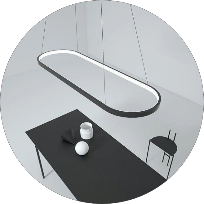 لوستر خطی بیضی دلوری با بدنهی آلومینیومی رنگ کورهای و نور LED قابل تعویض،