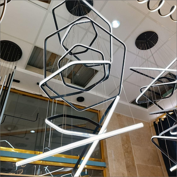 لوستر مدرن سقفی شش ضلعی زیبا و لاکچری رنگ نور آفتابی مهتابی یخی میباشد سایز کار در ابعاد 20،40،60،80سانتیمتر رنگ بدنه کوره ای درجه یک جنس بدنه الومینیوم دهنه کار با سیلیکون نسوز بسته میشود کاری بسیار زیبا و خاص مخصوص سخت پسندان ارتفاع کار از سقف قابل تنظیم میباشد.