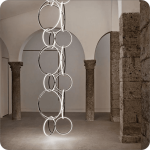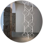 این لوستر از ۷ مربع با ابعاد 20 و 40 سانتیمتر تشکیل شده که به صورت زنجیرهای و منظم آویز شدهاند.