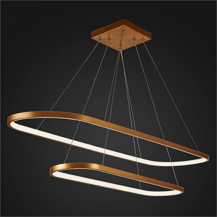 لوستر LED مدرن ، چراغ آویز خلاقانه طرحی جدید و فوق العاده خاص برای فضایی خاص و مدرن لوستر طرح بیضی در حالت دو طبقه مناسب میز ناهار خوری و اپن در سایز کلی سی سانت در یک متر و 40 در یک متر و بیست سانت در رنگ های سفید مشکی طلایی رنگ نورهای افتابی و نچرال و یخی ارتفاع از سقف 50 الی یک متر.
