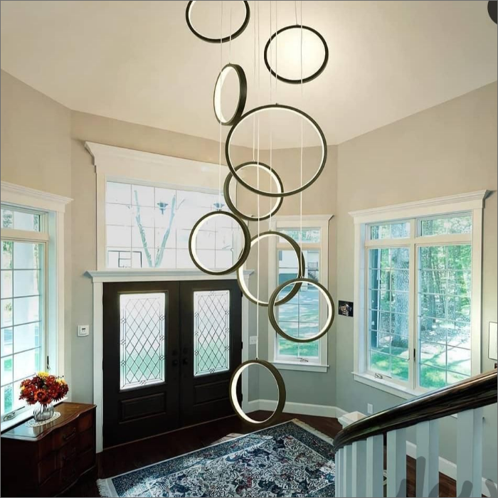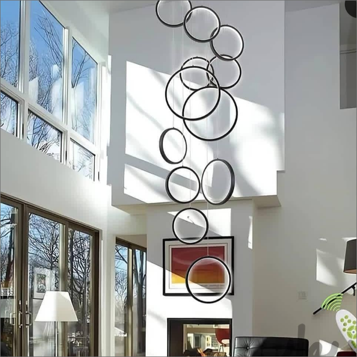 لوستر مدرن سقفی بلند طرح بی نهایت 12طبقه مناسب انواع دیوارهای بلند راه پله و پذیرایی سایز حلقه ها 30،40،50 ارتفاع سیم ها 3متر جهت آویز کردن در مدلهای مختلف بدنه آلومینیومی ضخیم ارتفاع از سقف قابل تنظیم دهنه سیلیکون نسوز در رنگهای نور آفتابی نچرال یخی میباشد.رنگ بدنه سفید مشکی طلایی