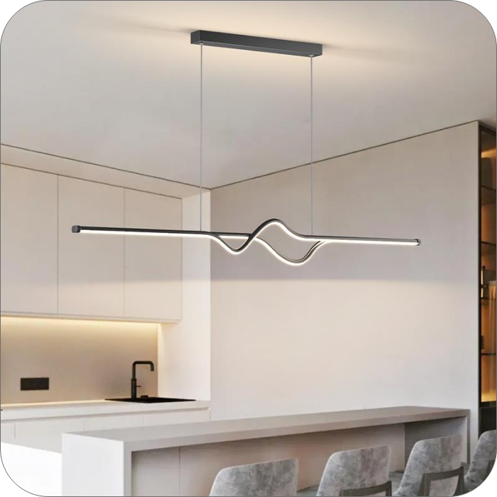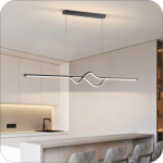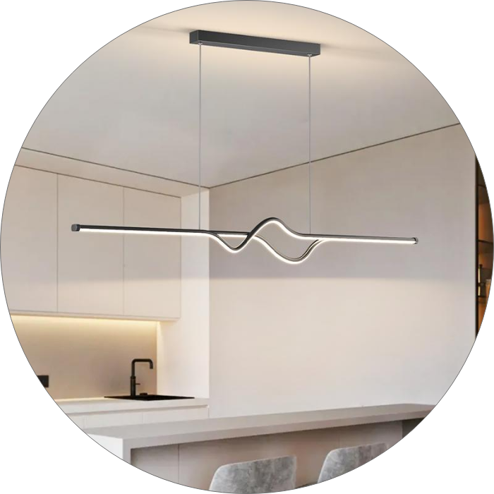 لوستر LED مدرن ، چراغ آویز خلاقانه جنس بدنه آلومینیومی و رنگ بدنه رنگ کوره ای درجه یک در سایز ۱.۲۰ سانتی متر در رنگ های سفید و مشکی و طلایی میزان نور دهی ۵۰ وات اس ام دی رنگ نور میتوانید آفتابی و نچرال و یخی سفارش دهید ارتفاع از سقف قابل تنظیم دهنه کار با سیلیکون نسوز بسته میشود.